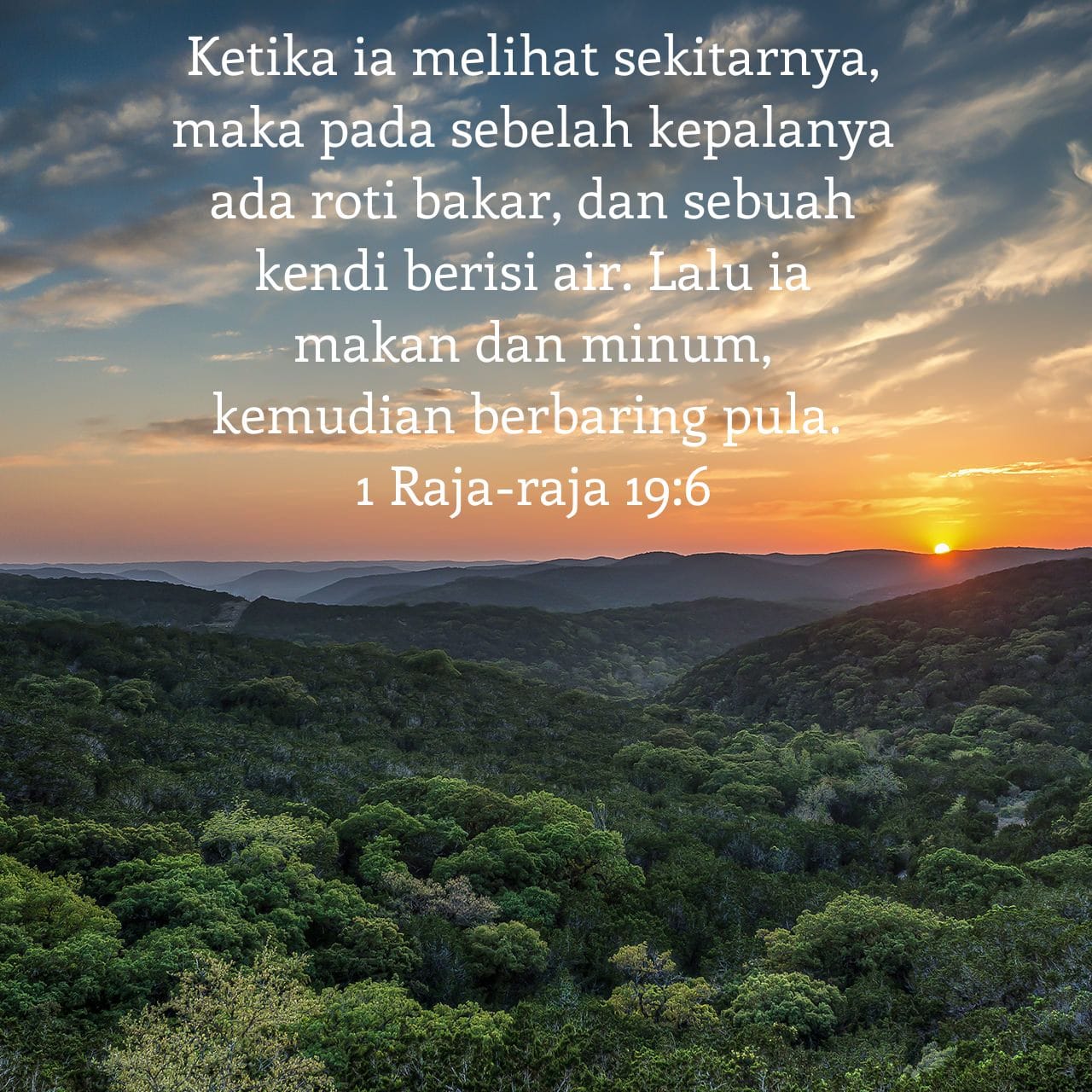 Elia melihat sekelilingnya, lalu tampak di dekat kepalanya sepotong roti bakar dan kendi berisi air. Ia pun makan dan minum, lalu berbaring lagi.