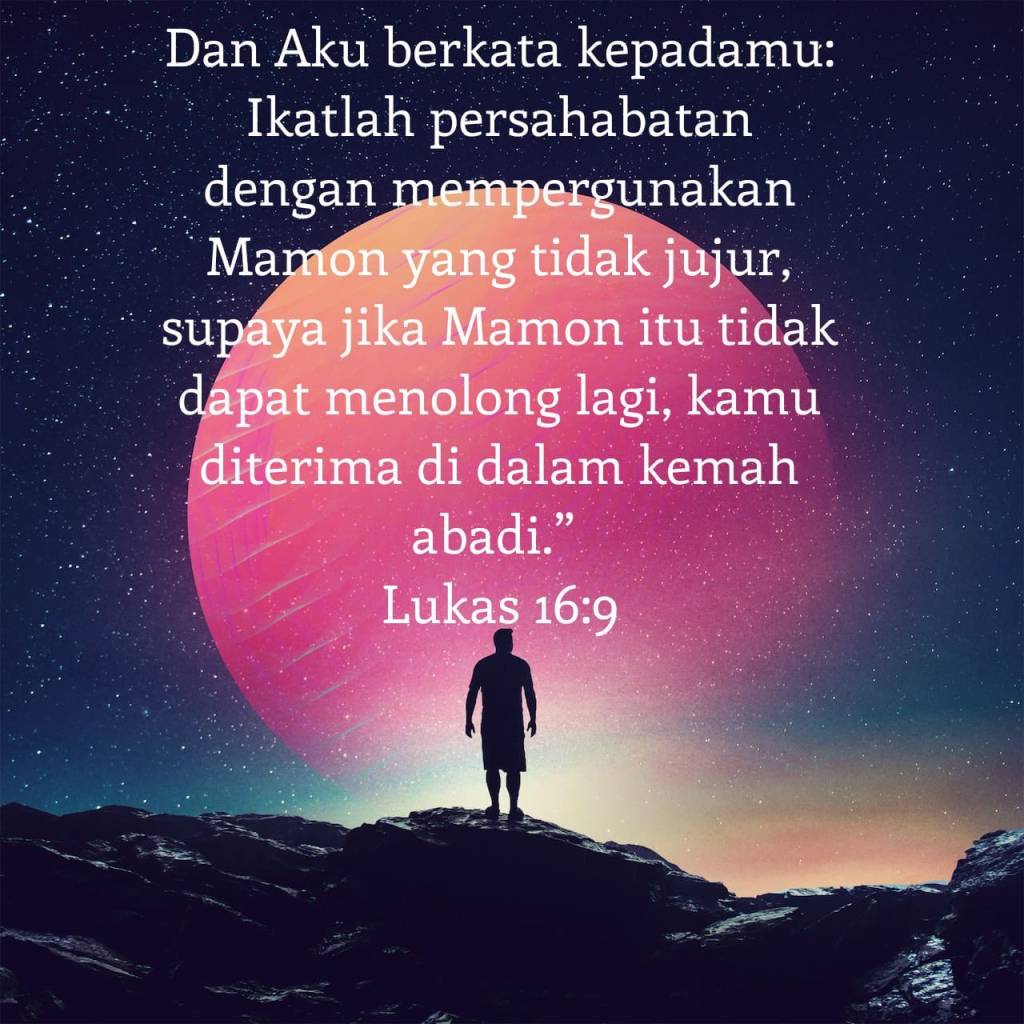 Dan Aku berkata kepadamu: Ikatlah persahabatan dengan mempergunakan Mamon yang tidak jujur, supaya jika Mamon itu tidak dapat menolong lagi, kamu diterima di dalam kemah abadi.