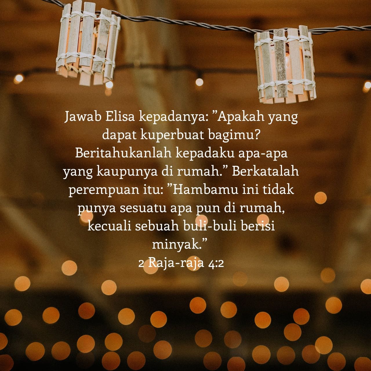 Persembahan dengan murah hati selalu lebih dari cukup ketika diserahkan ke tangan Allah. Dalam 2 Raja-Raja 4, seorang janda miskin meminta bantuan uang kepada Nabi Elisa. Elisa menyuruh janda itu menghitung apa yang dimilikinya, meminta bantuan kepada tetangganya, kemudian mengikuti perintahnya (ay.1-4). Allah memperlihatkan pemeliharaan-Nya yang ajaib dengan memakai sedikit minyak milik janda itu untuk mengisi semua bejana yang dikumpulkannya dari para tetangga (ay.5-6). Elisa berkata kepadanya, “Pergilah, juallah minyak itu, bayarlah hutangmu, dan hiduplah dari lebihnya, engkau serta anak-anakmu” (ay.7). Pertolongan Tuhan dlm kehidupan kita selalu luar biasa karena Tuhan selalu punya cara yg ajaib untuk menolong kita. Oleh karena kuncinya adalah tetap di dlm Tuhan dan taat melakukan firman Tuhan.