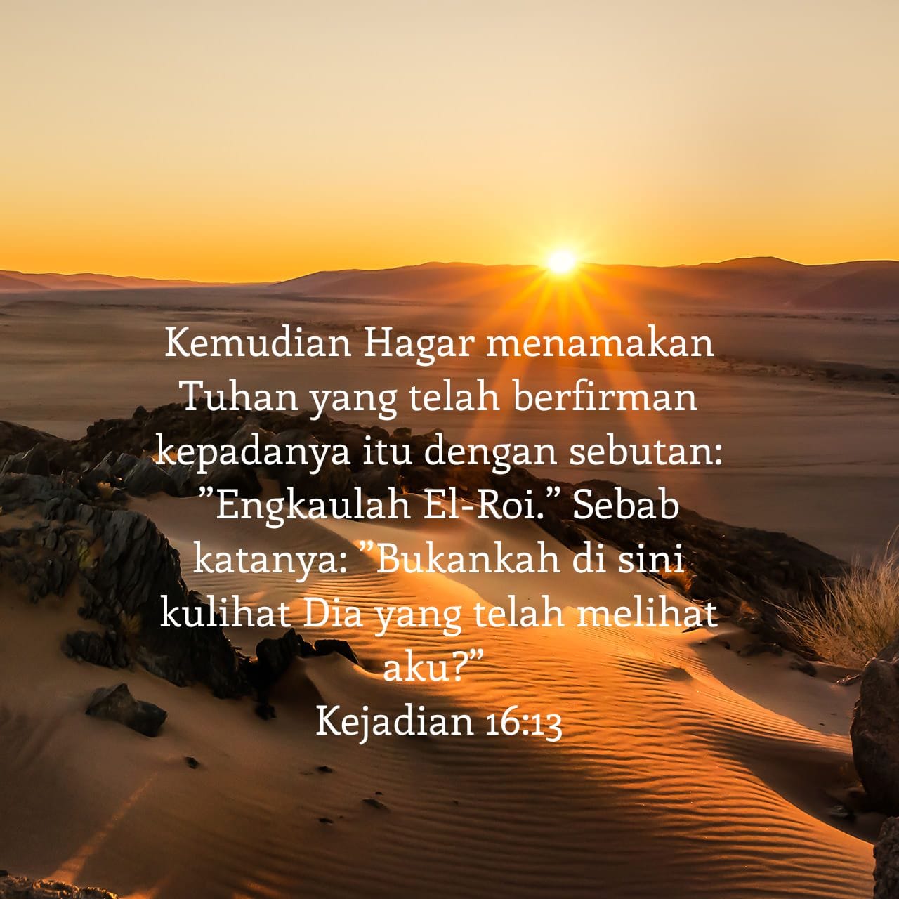 Namun, di padang gurun itulah “Malaikat Tuhan” (ay.7) menampakkan diri kepadanya dan berkata, “Tuhan telah mendengar tentang penindasan atasmu itu” (ay.11). Malaikat itu memberi petunjuk apa yang harus Hagar lakukan, dan meyakinkannya tentang masa depan yang menantinya. Dari Hagar kita mengenal salah satu nama Allah—El Roi, “Allah yang telah melihat aku” (ay.13). Terlebih kita anak2 Nya maka Tuhan pasti senantiasa memperhatikan kita di tengah kehidupan kita di dlm dunia ini, tak perlu takut dan gentar karena Tuhan memyertai kita.