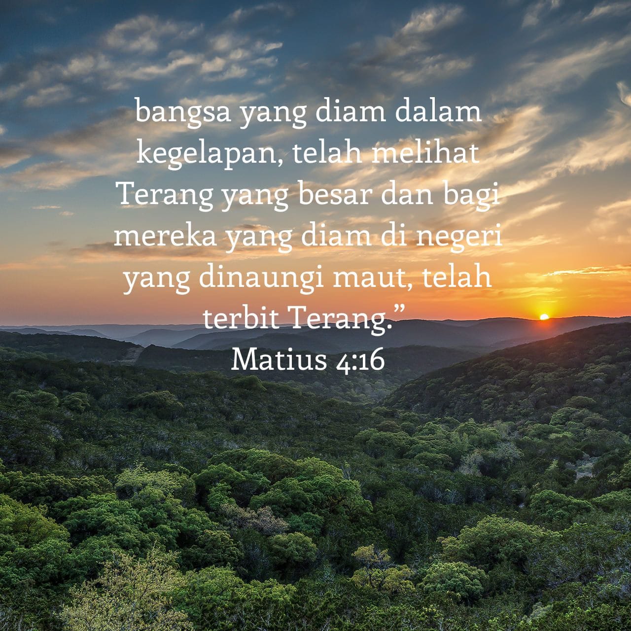 Terang itu adalah Pribadi namaNya Yesus. Dengan mengutip Nabi Yesaya, Matius menggambarkan terang yang datang ke dunia ketika Yesus tiba: “Bangsa yang diam dalam kegelapan, telah melihat Terang yang besar dan bagi mereka yang diam di negeri yang dinaungi maut, telah terbit Terang” (Mat. 4:16; lihat juga Yes. 9:1). Dampak dosa jelas terlihat di sekitar kita yang tinggal “di negeri yang dinaungi maut”. Akan tetapi, Yesus, Terang dunia yang besar dan gemilang, bercahaya menembus bayang-bayang kelam (Yoh. 1:4-5). Dunia adalah gambaran gelap yg artinya banyaknya kejahatan dan dosa dlm dunia ini, kita berada dlm dunia ini hrs membawa terang dlm hati kita sehingga kita tdk tersesat dlm dunia ini. Terang itu adalah Firman Tuhan yaitu Yesus Kristus.