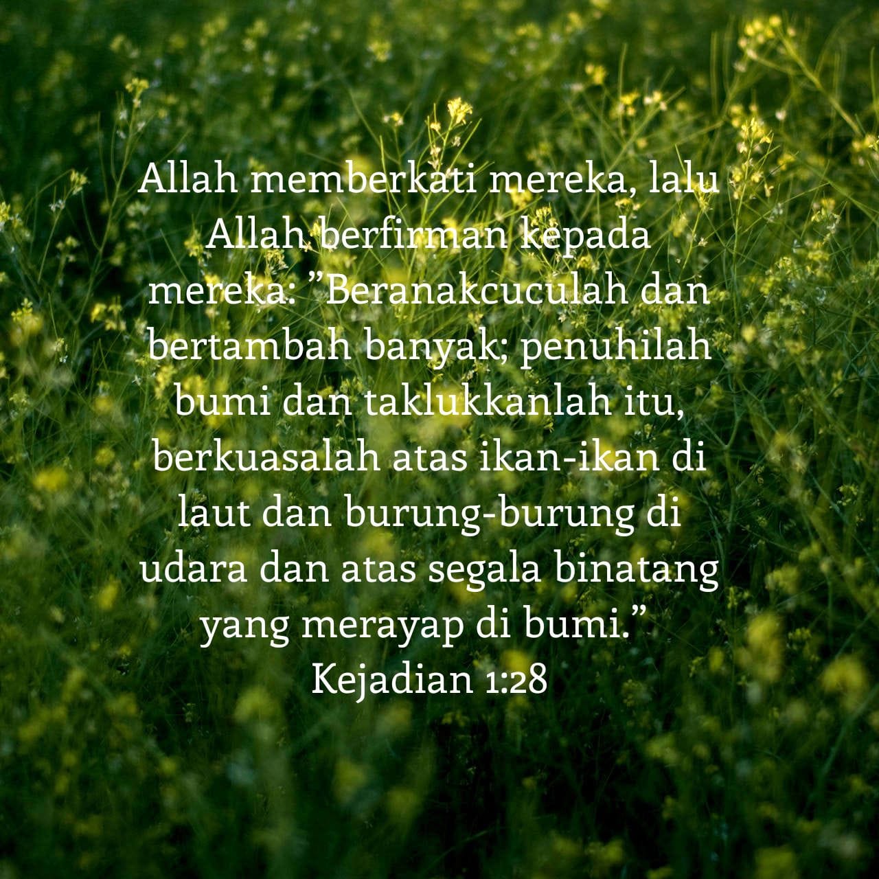 Ketika menciptakan dunia ini, Allah menyediakan habitat agar setiap makhluk dapat hidup dan berkembang (Kej. 1:20-25). Ketika menciptakan manusia yang segambar denganNya, Allah menghendaki kita untuk berkuasa atas ikan2 di laut dan burung-burung di udara dan atas ternak dan atas seluruh bumi dan atas segala binatang melata yang merayap di bumi (ay.26). Allah memampukan kita untuk melayani Dia sebagai pengelola yang bertanggung jawab, dan kita merawat alam ciptaan ini dengan otoritas yang diberikan-Nya. Tuhan menyiapkan semua nya untuk kehidupan manusia bahkan Tuhan memberikan otoritas untuk menguasai dan memgelola semua ciptaanNya. Tuhan menciptakan apa yg menjadi kebutuhan manusia, dan sampai sekarang kehidupan kita selalu di cukupkan, kita percaya penuh atas pemeliharaan Tuhan Yesus yg luar biasa.