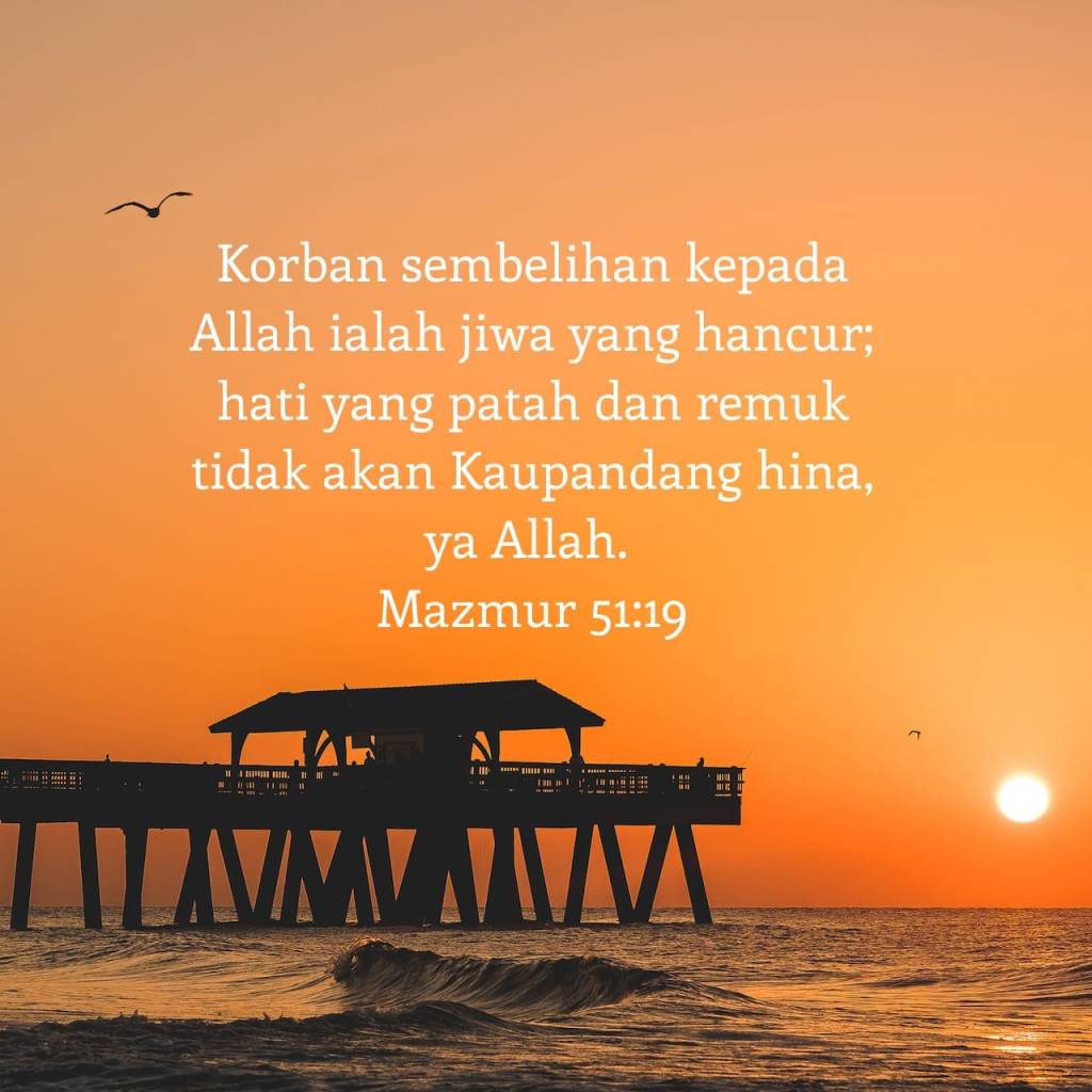 Korban sembelihan kepada Allah ialah jiwa yang hancur; hati yang patah dan remuk tidak akan Kaupandang hina, ya Allah.