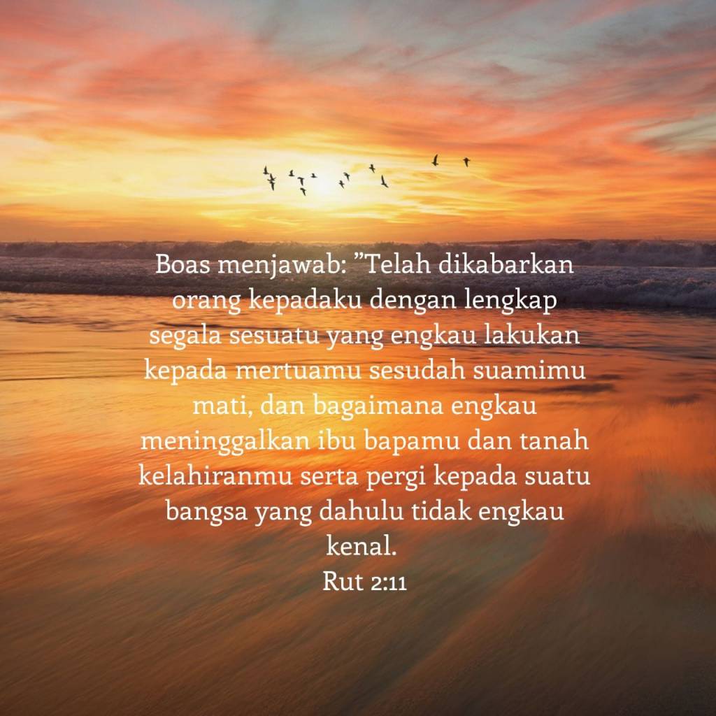 Ketika Rut berkomitmen untuk merawat ibu mertuanya, Naomi, ia meninggalkan rasa aman dari lingkungan yang sudah ia kenal. Rut “sampai di ladang dan memungut jelai di belakang penyabit-penyabit“ (Rut 2:3). Mandor yang bertugas di sana berkata kepada pemilik tanah, Boas, bahwa Rut “datang dan terus sibuk dari pagi sampai sekarang dan seketikapun ia tidak berhenti“ (ay.7). Rut menemukan tempat yang aman bersama orang-orang yang bersedia merawatnya, sama seperti ia merawat Naomi (ay.8-9). Allah pun memelihara Rut dan Naomi lewat kemurahan hati Boas (ay.14-16). Ketika semua dlm rencana Tuhan maka Tuhan pasti memelihara dgn kasihNya yg besar dan tak akan di tinggalkannya hidup kita. Rut memilih yg benar dia tetap bersama naomi.