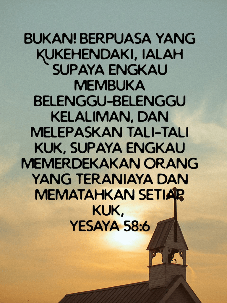 …..membuka belenggu-belenggu kelaliman, dan melepaskan tali-tali kuk, supaya engkau memerdekakan orang yang teraniaya dan mematahkan setiap kuk,