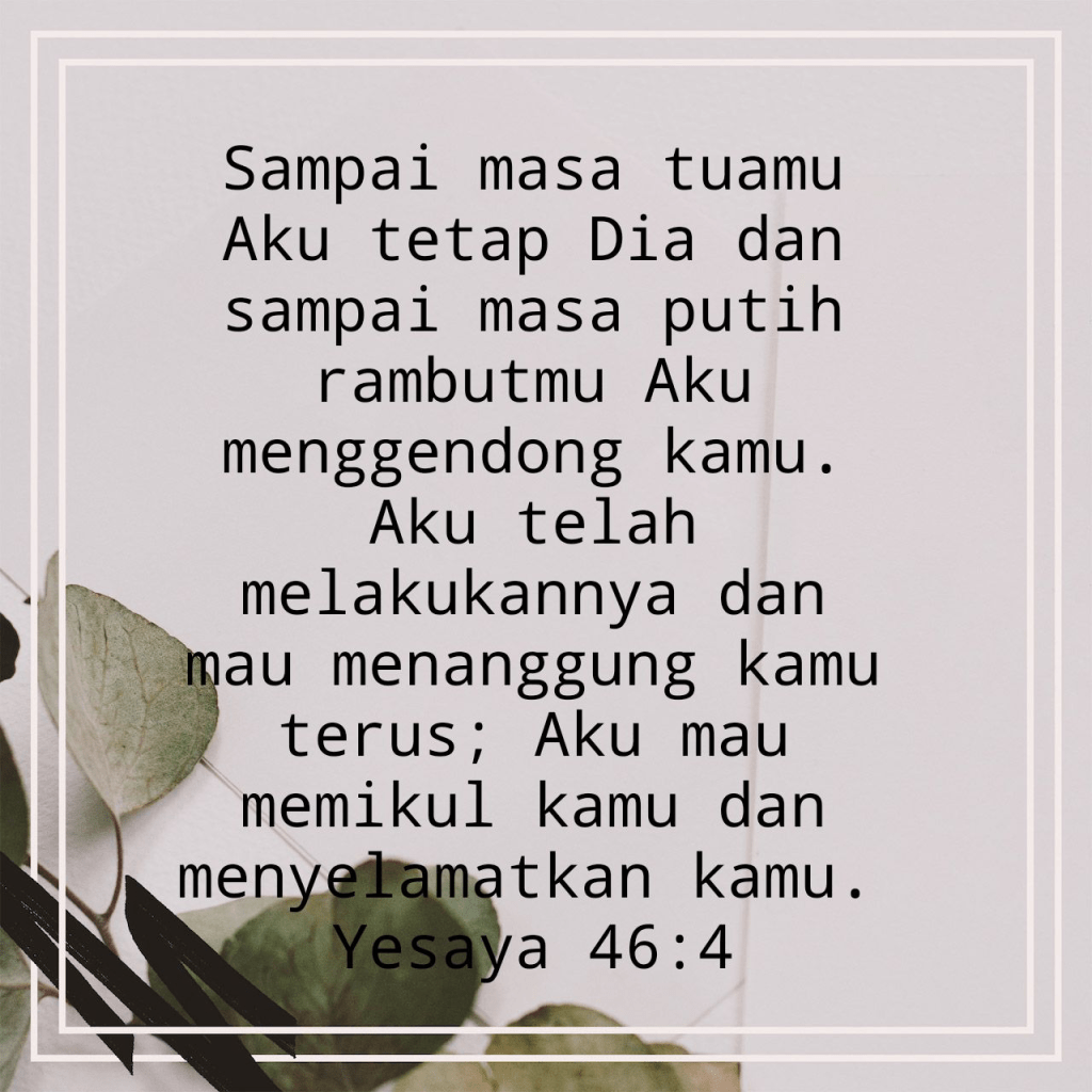 Sampai masa tuamu Aku tetap Dia dan sampai masa putih rambutmu Aku menggendong kamu. Aku telah melakukannya dan mau menanggung kamu terus; Aku mau memikul kamu dan menyelamatkan kamu.