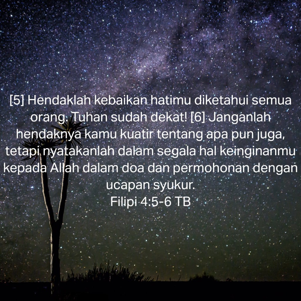 Tuhan sudah dekat! Janganlah hendaknya kamu kuatir tentang apa pun juga, tetapi nyatakanlah dalam segala hal keinginanmu kepada Allah